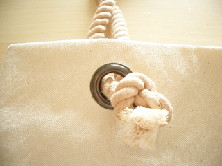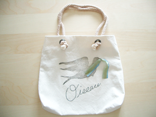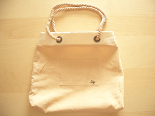 表地は11号帆布、裏地は薄手シーチング、共に綿100%。 リボンはシルクです。 プリントはハンドプリント、文字は手刺繍なので、ひとつひとつ表情が異なります。 裏地とロープは紅茶で染めています。