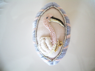 モモイロペリカンのブローチです。 裏面はレザーでできています。 裏地のお色は変更になる場合があります。 ブローチピンをヘアゴムに変更することできます。 ご希望の場合オーダーの際お申し付けください。