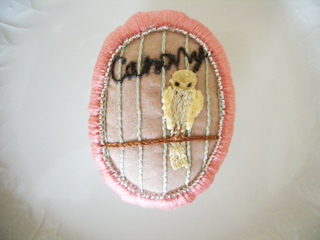 鳥かごの中のカナリアです。 裏面はレザーでできています。 裏地のお色は変更になる場合があります。 ブローチピンをヘアゴムに変更することできます。 ご希望の場合オーダーの際お申し付けください。