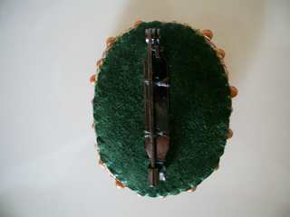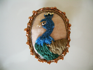 ブルーの体が美しいクジャクのブローチです。 裏地のお色は変更になる場合があります。 裏面はレザーでできています。 ブローチピンをヘアゴムに変更することできます。 ご希望の場合オーダーの際お申し付けください。