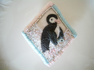 氷山をバックにお魚を持ったペンギン。 裏面はレザーでできています。 裏地のお色は変更になる場合があります。 ブローチピンをヘアゴムに変更することできます。 ご希望の場合オーダーの際お申し付けください。
