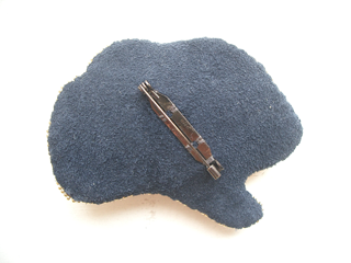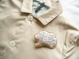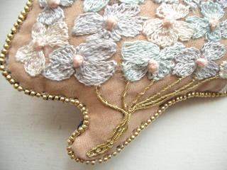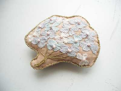 コットンの糸とグラスビーズの刺繍、裏面にはレザーを使用しています。 サイズは9cm×6.5cmくらい。 細かいチェーンステッチで花びら一枚一枚を描いたアジサイ。 大き目のブローチはコートなどのアウターにぴったりです。