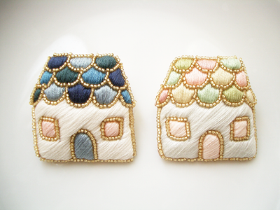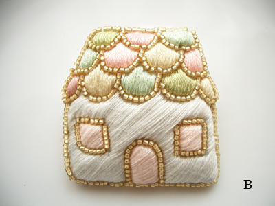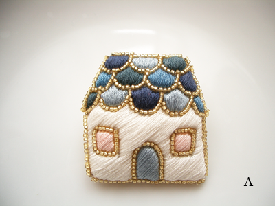 いろんな色の瓦の重なった屋根がポイントのブローチ。